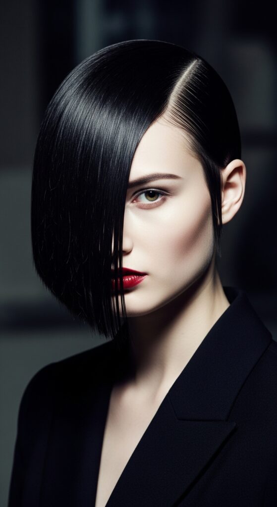 Channel a modern, sophisticated vampire aesthetic with this look. The vampire haircut inspiration here means sharp, blunt-cut braids, often with a deep side part and a dramatic length variation.