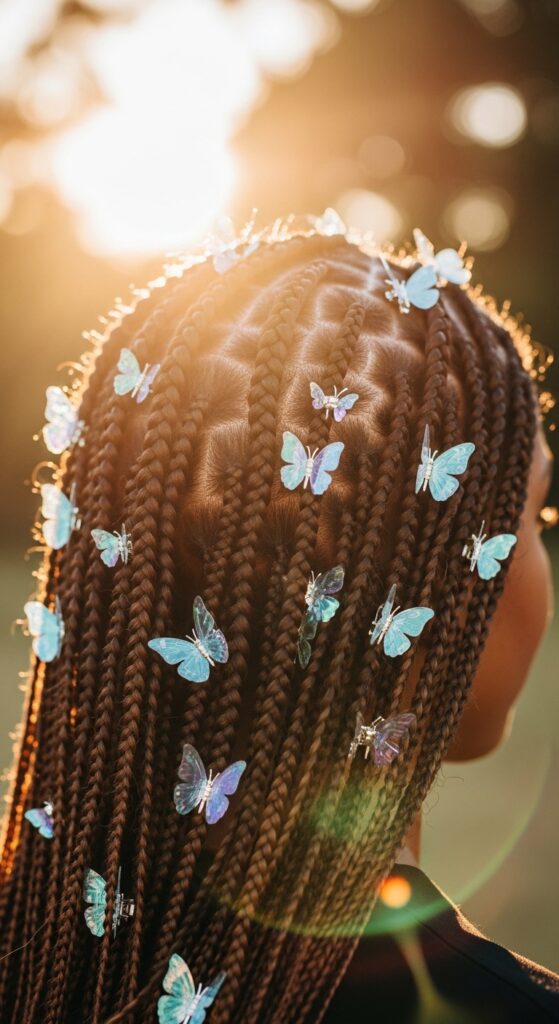 Take your accessory game to ethereal new heights. Weave in delicate butterfly clips, star hair pins, or chain-linked hair jewelry into your knotless braids. This creates a magical, fairy-like effect that’s perfect for special events.