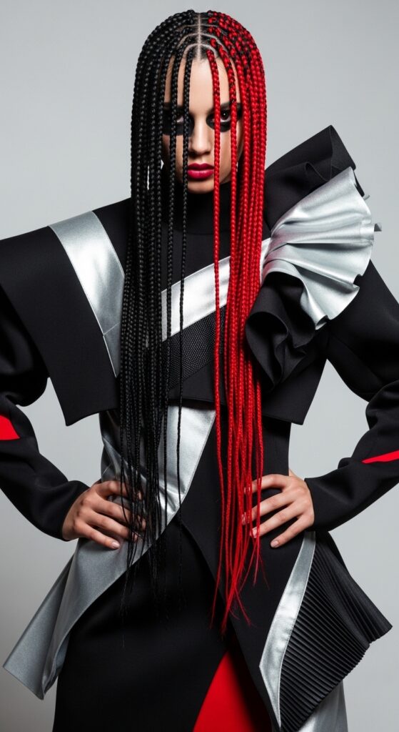 For a truly fashion-forward statement, try bold color blocking. Think one solid color on one side and a contrasting color on the other, or dark braids with a bright, bold streak in the front.