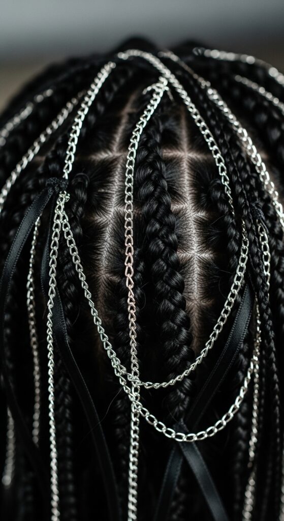 Merge delicate romance with a dark aesthetic for a stunning romantic goth hairstyles moment. Think deep black or burgundy knotless braids adorned with delicate silver chains, velvet ribbons, or dark pearl pins.