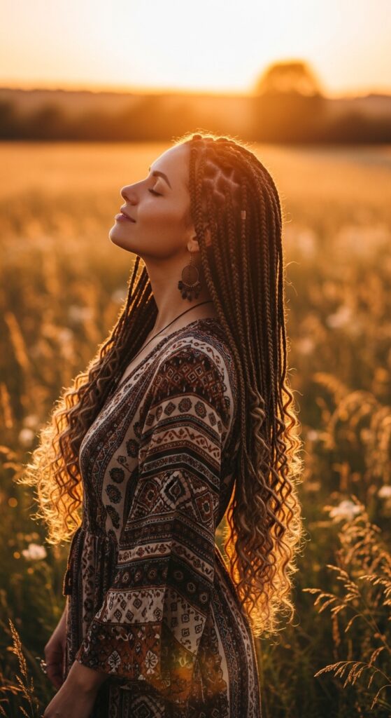 Unleash your inner goddess with this breathtaking style. Long, flowing knotless braids are given a soft, romantic touch by adding loose curls or waves at the ends. It adds incredible movement and a touch of whimsy.