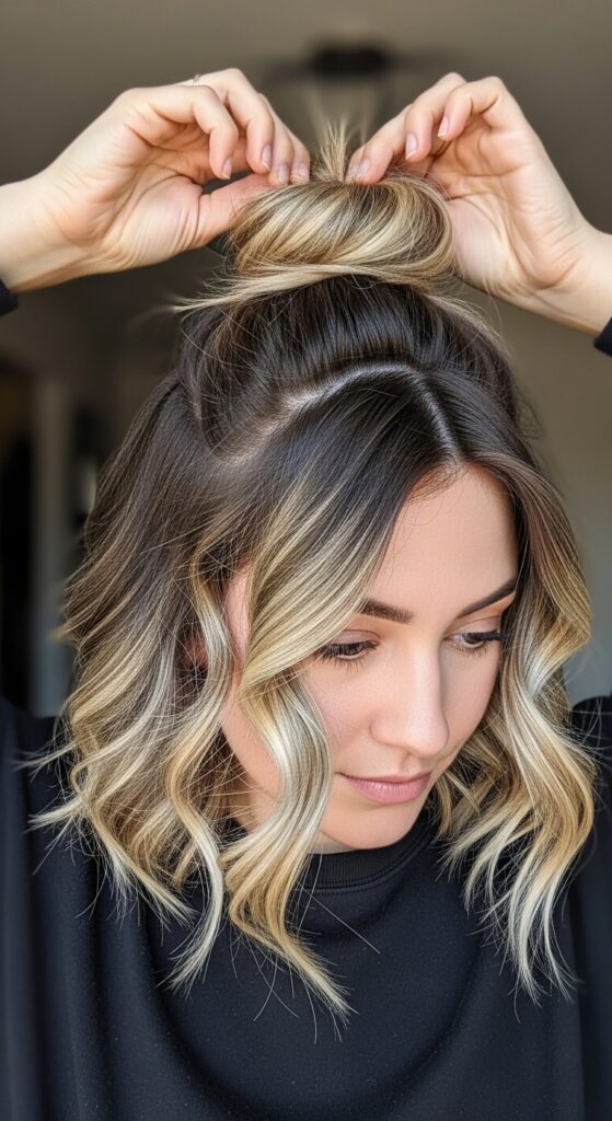 If you have a bob, lob, or shorter hair, don’t think heatless styles aren’t for you! The sock bun method is a game-changer. It gives tons of volume and bounce, perfect for an asymmetrical lob.