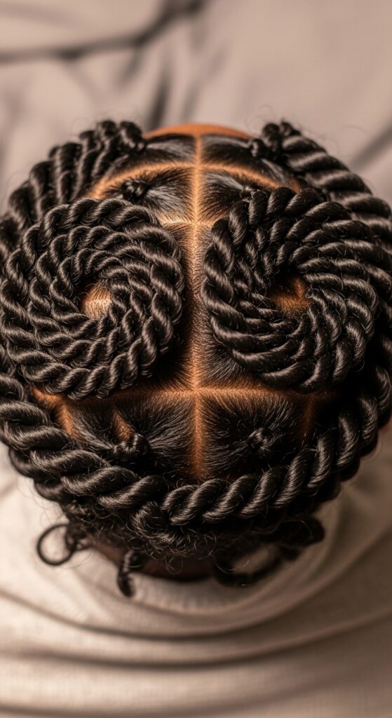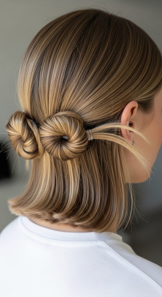- Twist each section into a bun and secure it with a small coil-less hair tie or scrunchie.
