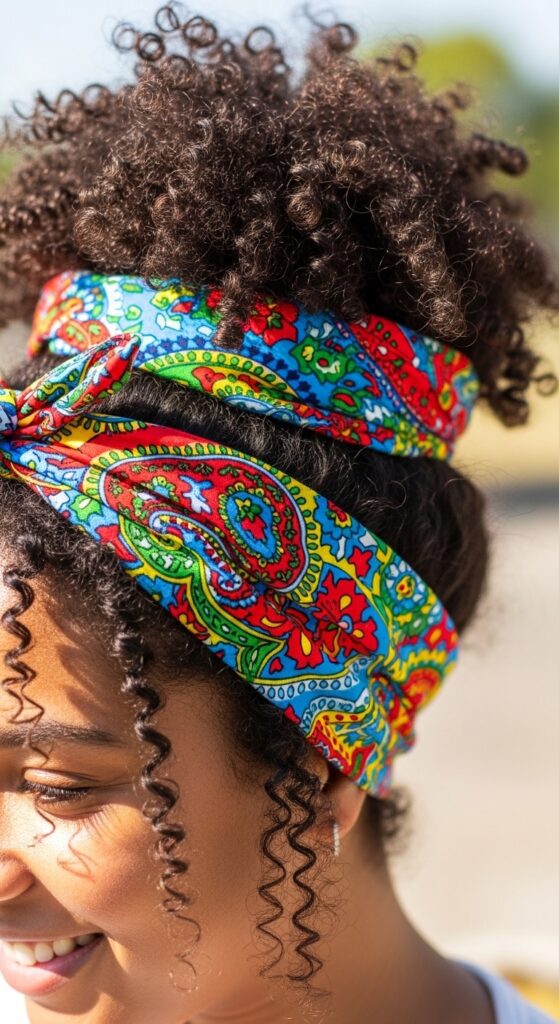- Fold a bandana into a triangle and tie it around your head, covering your hairline.