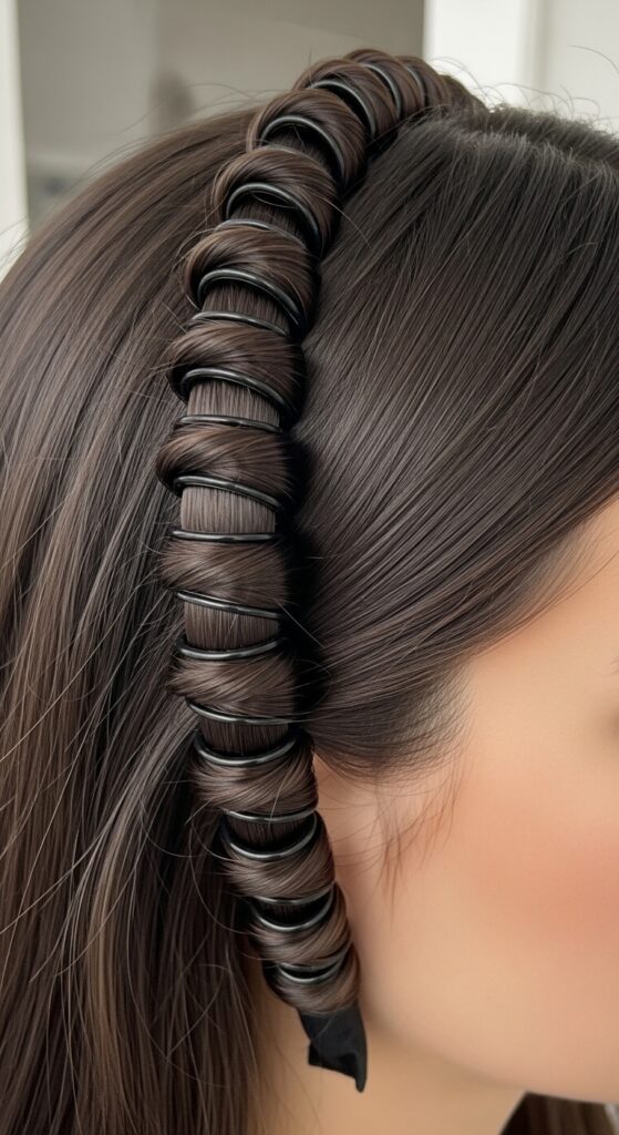 - Take small sections of hair, wrap them around the headband, and tuck the ends under.