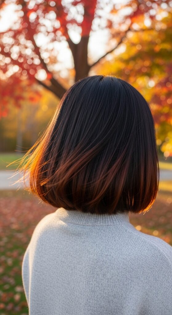 Add a warm, subtle pop of color with auburn or copper tips on a dark brunette micro bob. It’s like a reverse ombre that’s romantic and unexpected.