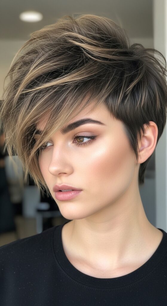 Double down on the boldness with ultra-short, choppy bangs. This gives off major artistic and daring energy. It’s a key element in glitchy glam hair aesthetics.