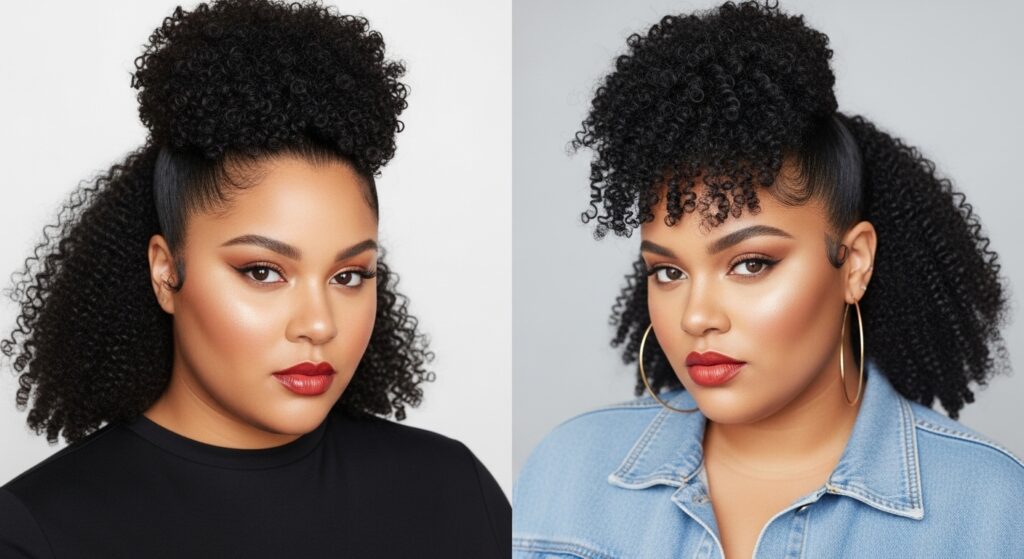 9. Curly Hair Power Pony: For our curly girls, embrace your natural texture! Gather curls at the mid-height, using just your hands to preserve definition and volume for a stunning, bold look.