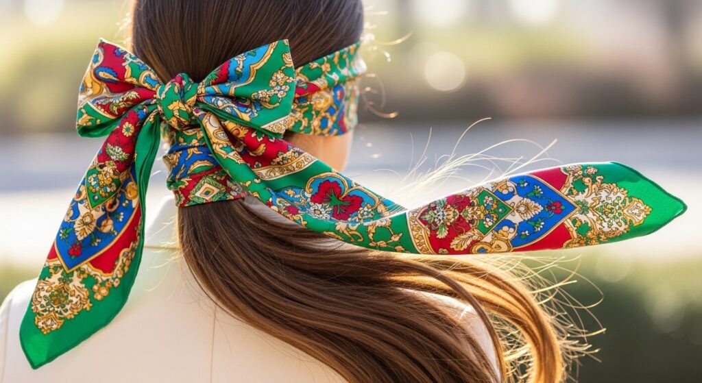 16. Scarf-Wrapped Pony: Take a silk or patterned scarf, fold it into a band, and tie it around the base of your ponytail. Let the ends flow for a Parisian chic feel.
