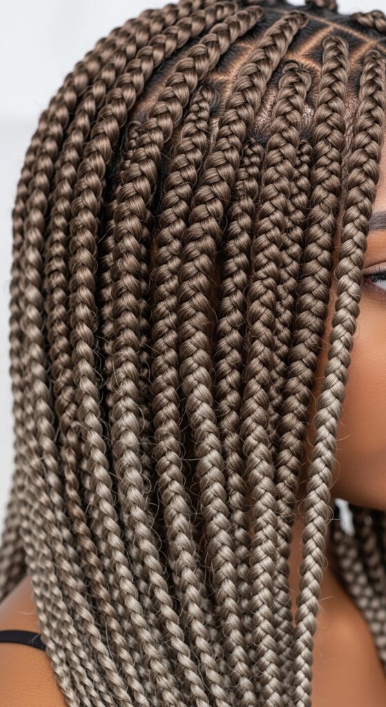 Protective styles can have dimension too! Ask your braider to use a blend of mocha brown and ash brown braiding hair. They can create a custom balayage effect as they braid.