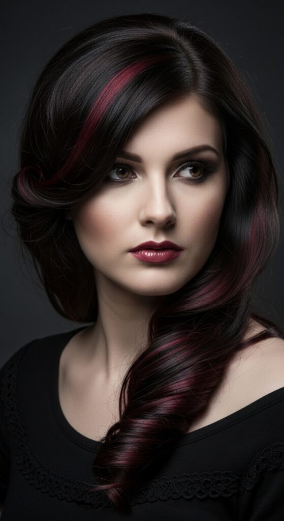 In the light, these colors peek through. Style it with soft, cascading curls for a modern vampire romance novel look. It’s dark, poetic, and utterly captivating.