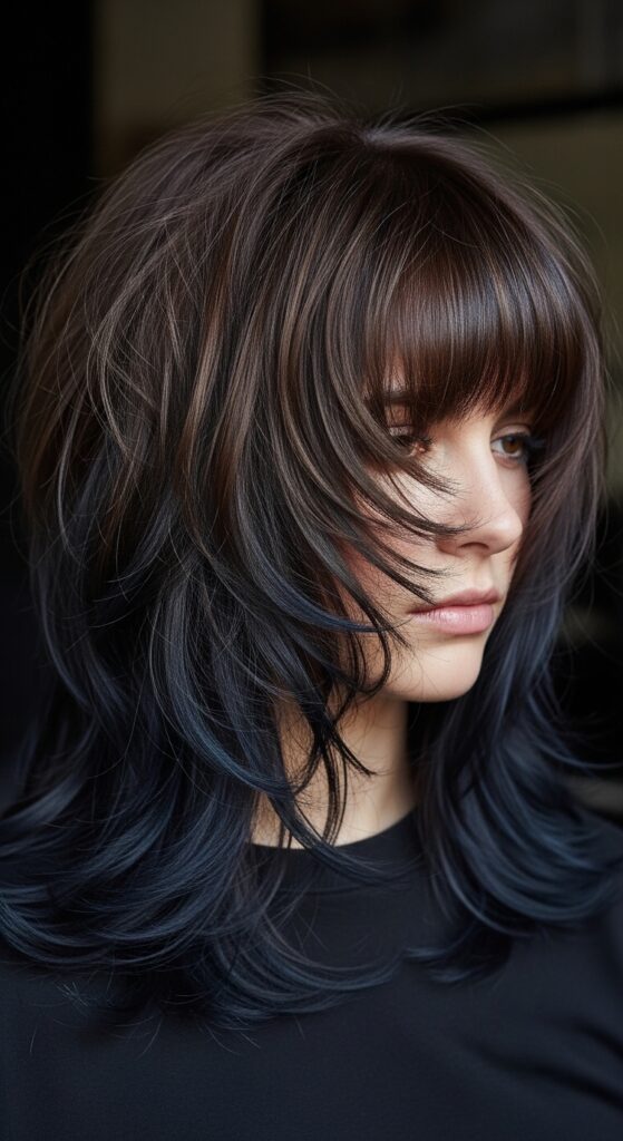 The vampire haircut is all about texture, layers, and a certain mysterious vibe. Pair it with a deep mocha base and add even darker, blue-black lowlights.