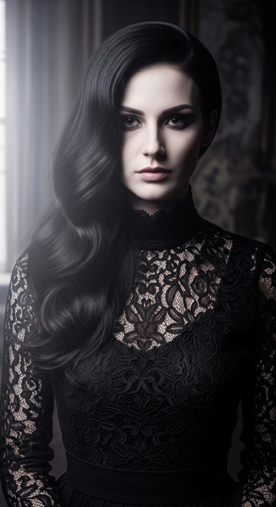 Romantic goth hairstyles are all about dark, luxurious texture and a touch of Victorian drama. Imagine deep, raven waves, lots of volume at the crown, and perhaps some face-framing pieces.