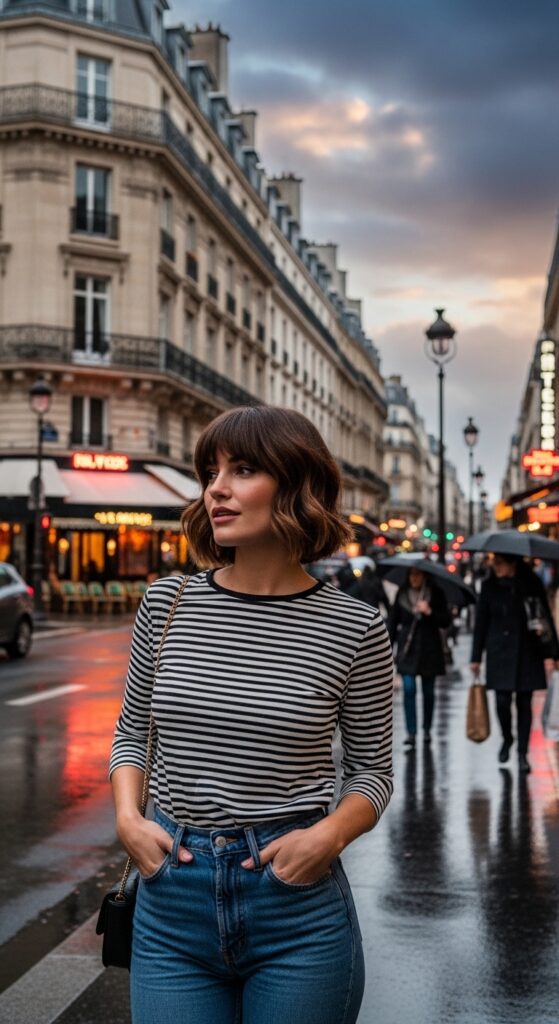 The French bob is the epitome of Parisian cool. It’s chin-length, slightly stacked in the back, and often paired with full, straight-across bangs. The textured version is less precise and more effortless.