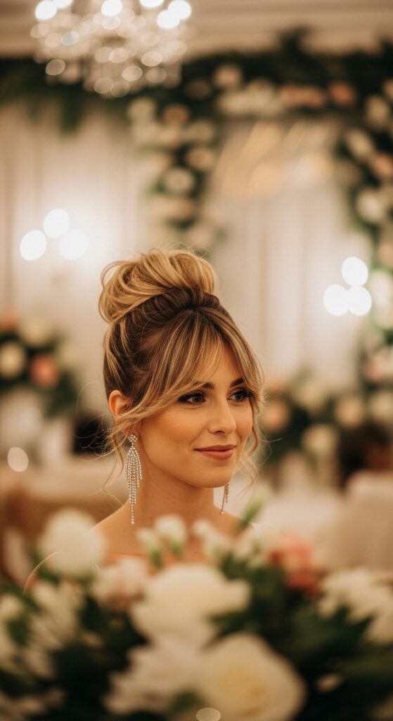 The goalie bun gets a glam upgrade. A messy, high bun with intentional wispy pieces and face-framing layers left out is chic and saves you on a bad hair day.