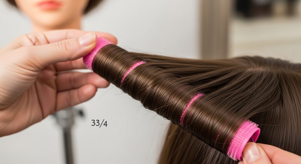 12. The “Underwrapped” Bottom Layer: For a smooth silhouette, wrap the bottom layer of hair (the nape area) on larger rods, or even wrap them slightly under (directed downward) to prevent unwanted pouf.