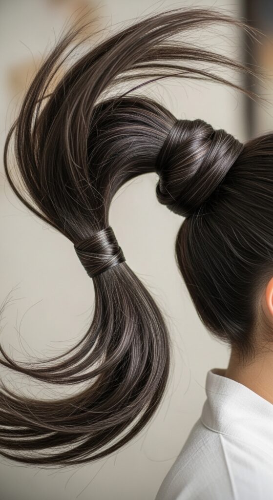 Create the tight, flat base of the samurai bun, but leave a section of the ponytail hanging out as a tail. It’s a hybrid look that combines structure with movement.