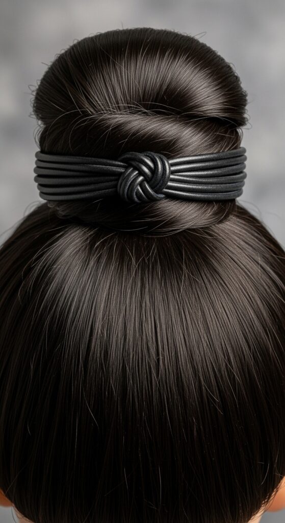 Wrap multiple thin leather cords or metallic hair bands around the base of the bun. This adds a raw, tactical element to the style, like something a modern warrior would actually wear.