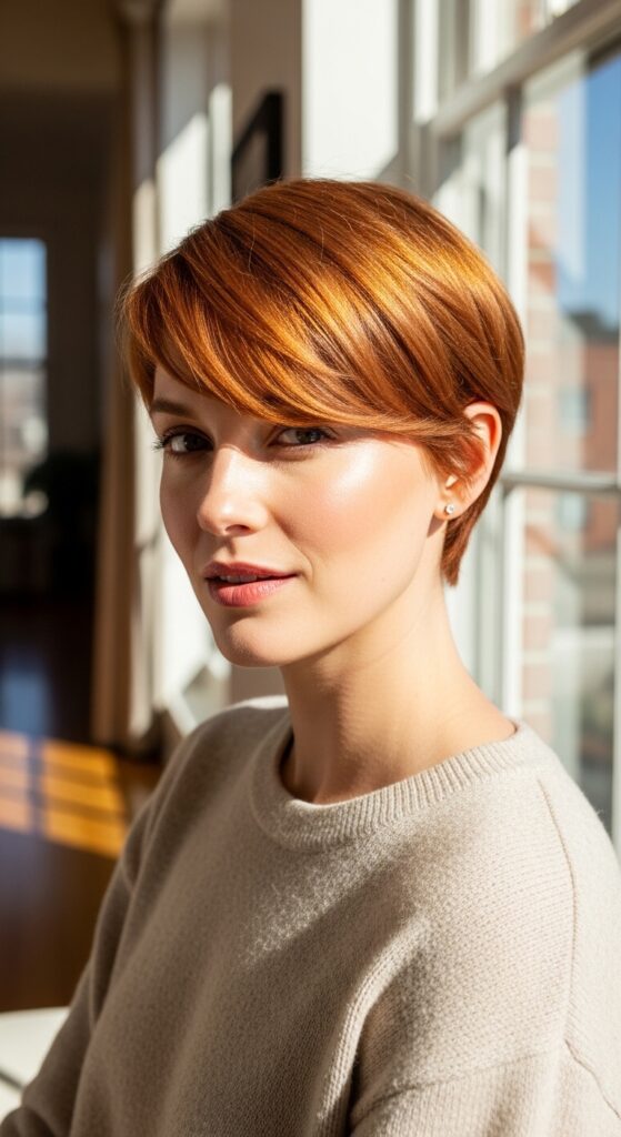 A copper pixie cut is a power move. It’s bold, confident, and incredibly easy to style. Opt for a lighter, almost peach-toned copper to keep it soft and wearable.