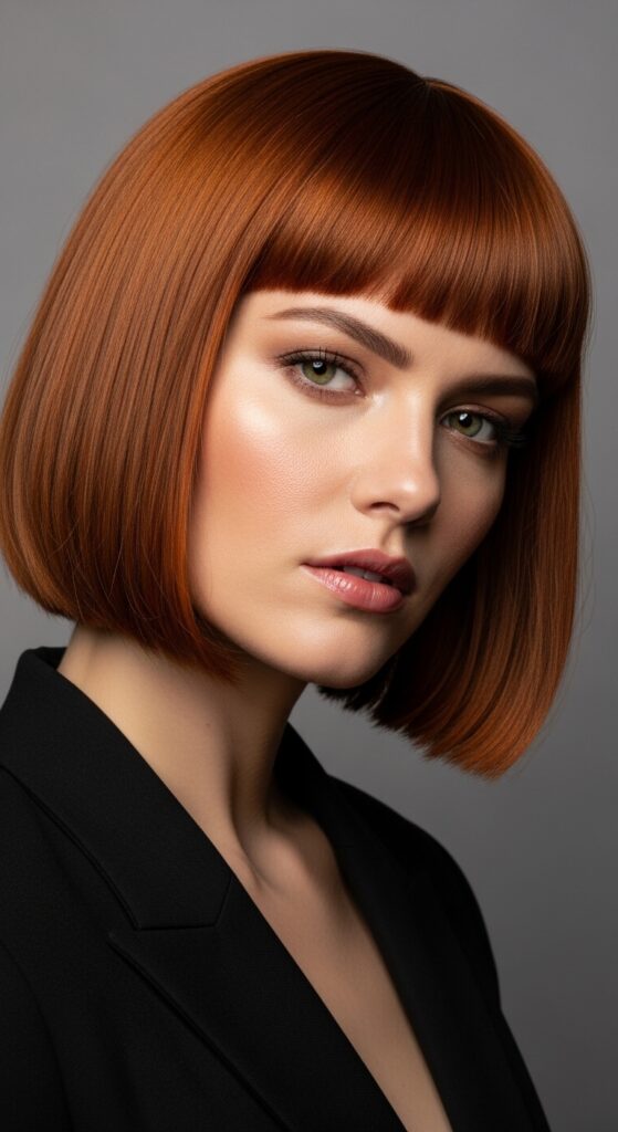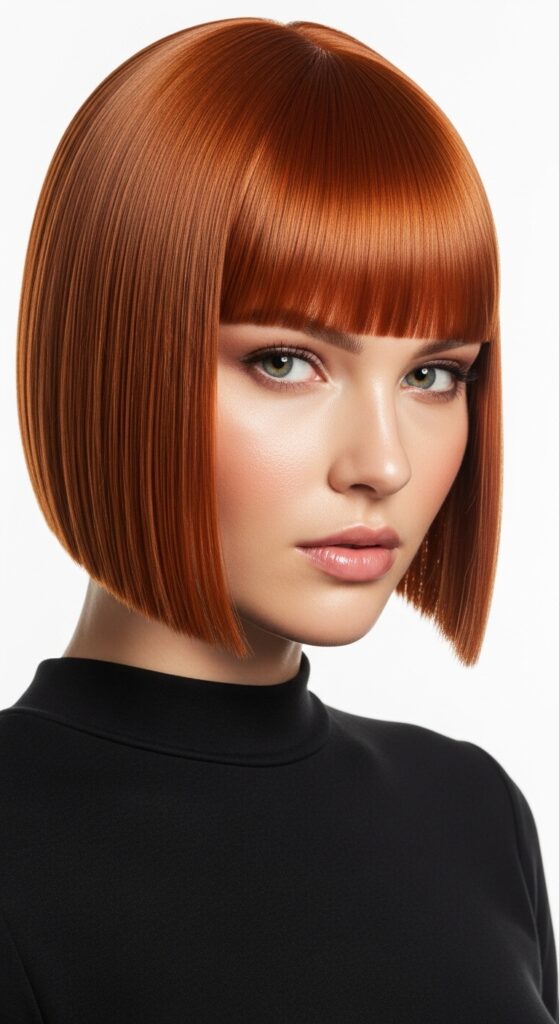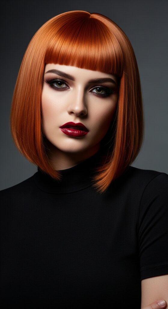 Blunt bangs plus copper? Absolutely. This combination makes a statement without needing any fancy styling. The sharp lines of the cut contrast beautifully with the warm color.