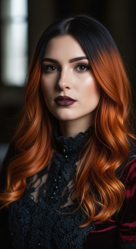 Romantic goth hairstyles get a warm makeover with copper. Let your natural dark roots grow out a bit, then fade into a vibrant, almost fiery copper.
