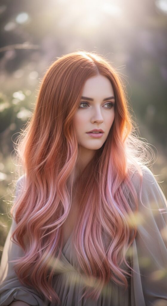 Why choose between copper and pink when you can have both? This gradient look starts with warm copper at the roots and fades into a soft strawberry pink at the ends.