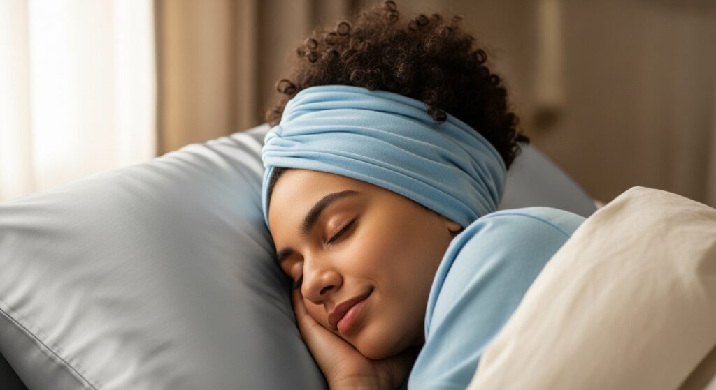 14. The Satin-Lined Hood: Place a satin scarf over your hair, then use a T-shirt tied around your head to create a soft hood that keeps the scarf in place.