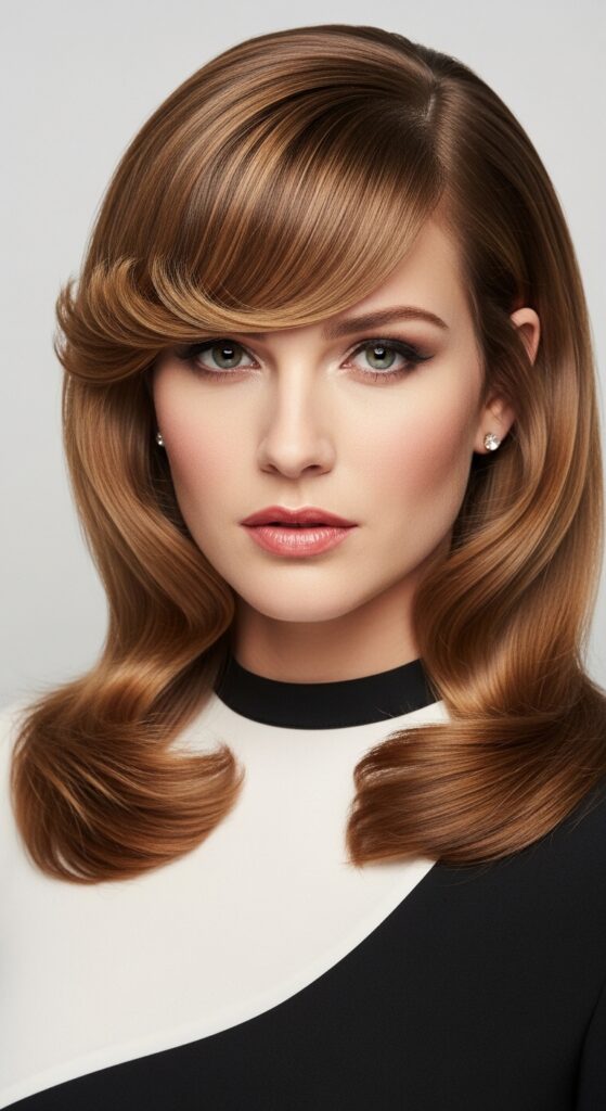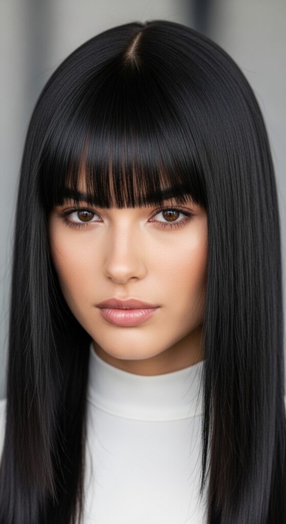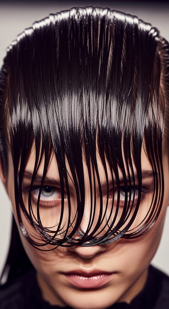 It’s edgy, cool, and perfect for a statement event. This style turns your bangs into a sculptural element. It’s a key look on runways and in street style.