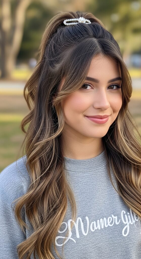 - Styling tip: Gently pull a few tiny hairs down around your ears to soften the half-up line.