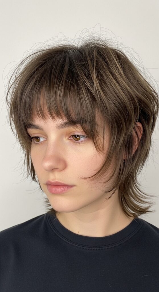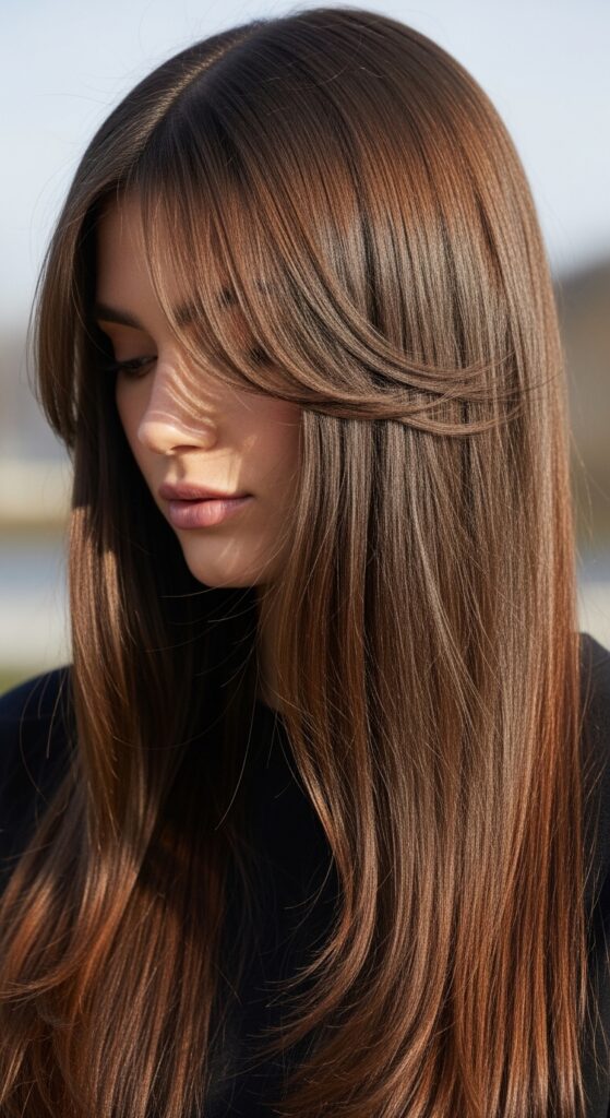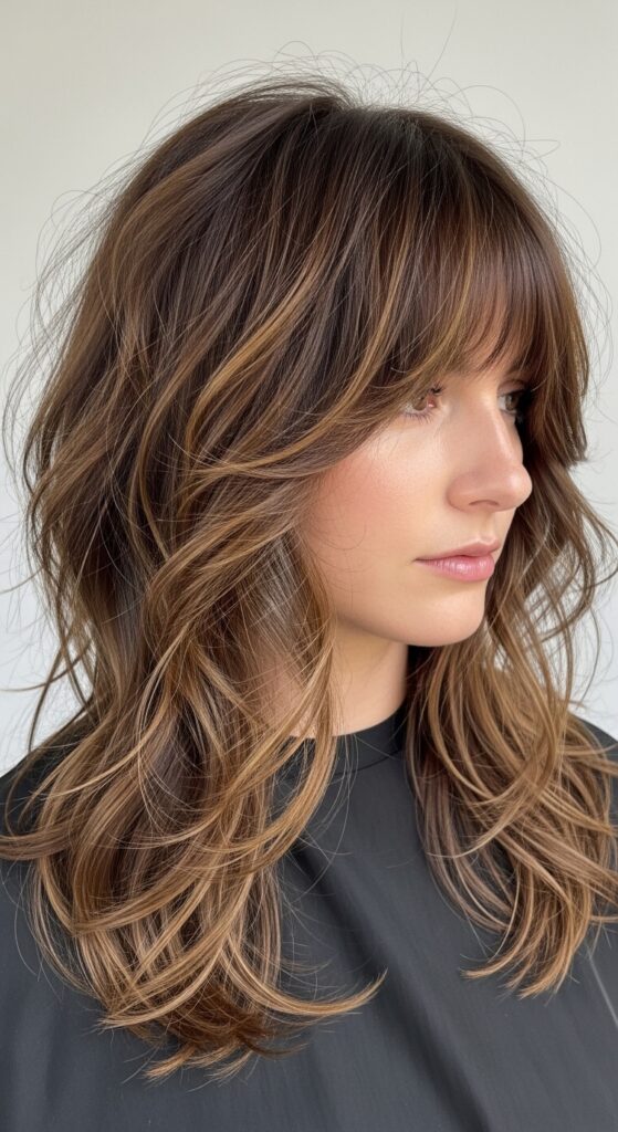 The bangs blend into the layers around your face, creating a seamless, feathered effect. It’s a low-maintenance style that looks great air-dried or with a bit of texturizing spray.