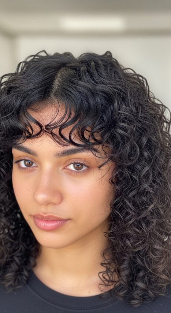 Curly girls, this one’s for you! Curtain bangs on curly hair are absolute magic. They reduce bulk around the face and highlight your features. The cut must be done dry, curl by curl.