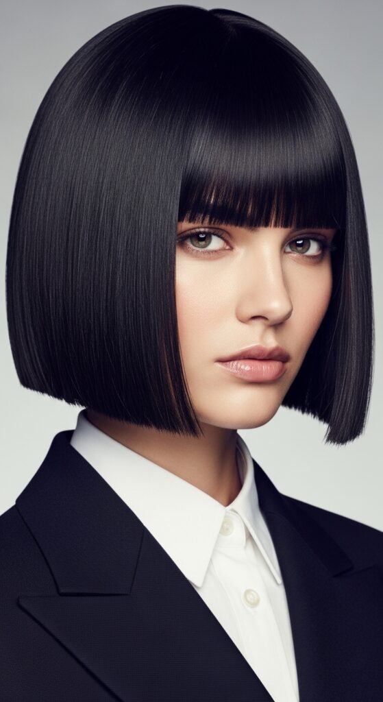 This is all about that quiet luxury bob energy. The hair is supremely healthy, shiny, and perfectly cut. The curtain bangs are blended seamlessly into a one-length or slightly layered bob.