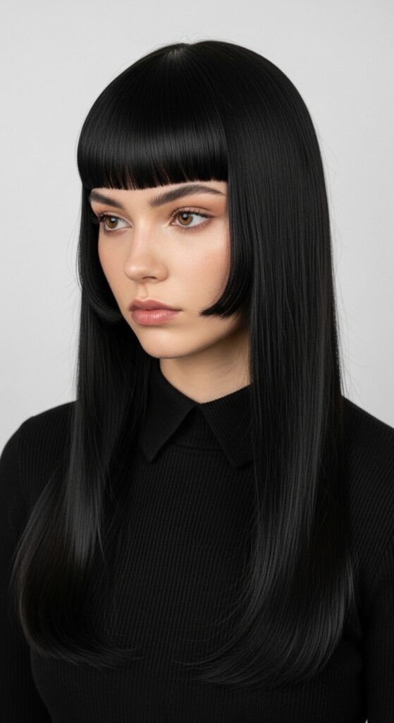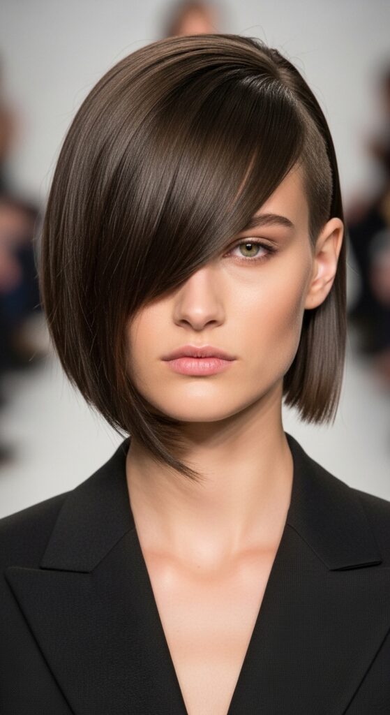 It’s graphic, clean, and very stylish. It works best on straight hair and has a cool, almost architectural feel. It’s a standout look for 2026 hairstyles.