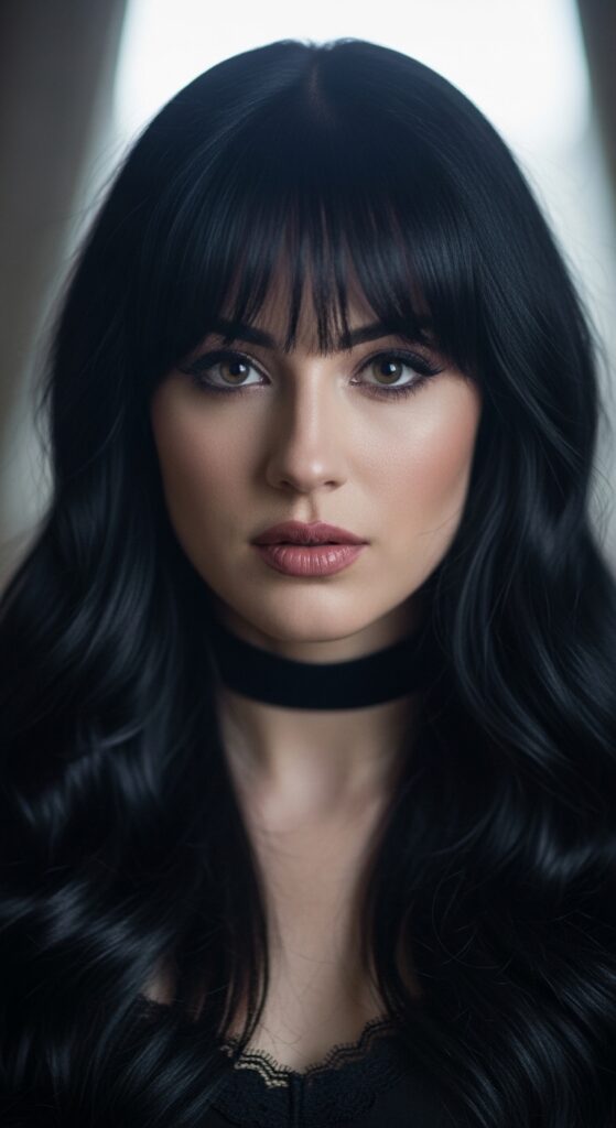 Romantic goth hairstyles are huge, and curtain bangs are the perfect soft addition. Imagine deep, dark hair with soft, wispy bangs that create a mysterious frame for the eyes.