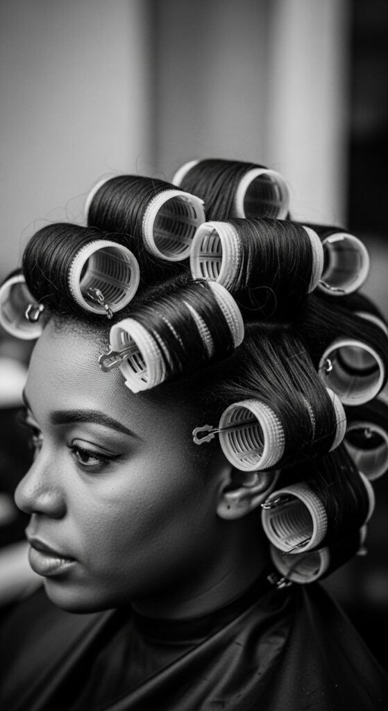 A roller set gives you stretch, volume, and a gorgeous curl pattern that’s different from your natural coil. A swept-back roller set is especially glamorous, giving you height at the crown and soft curls throughout.