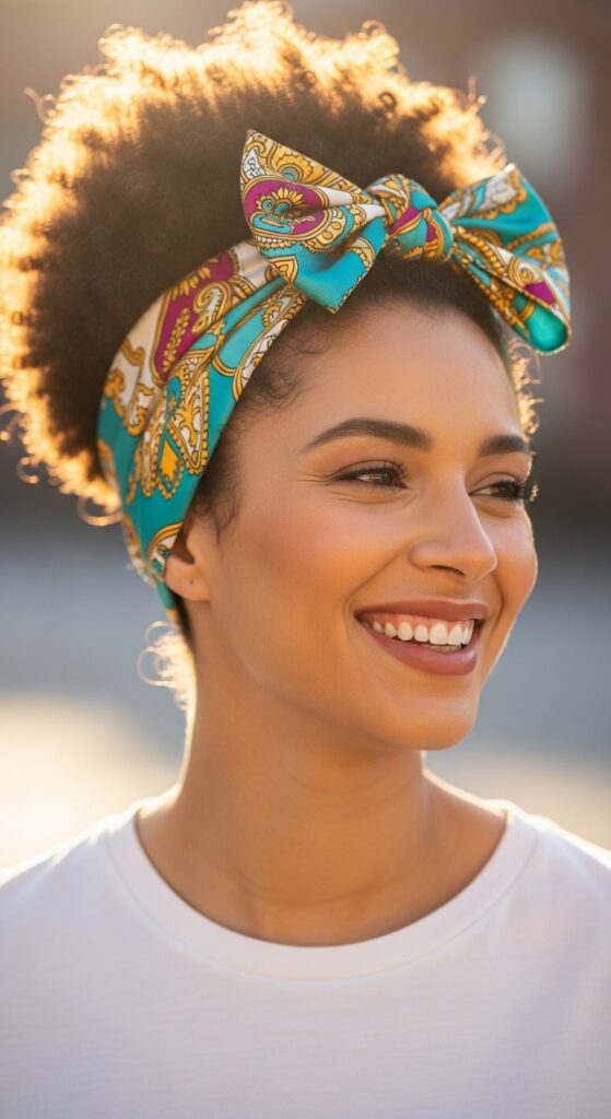 Adding a scarf takes it from casual to chic in two seconds. It protects your edges and adds a pop of color or pattern. This is my go-to “I need to look put together in 5 minutes” style. Just gather, tie, and fluff!