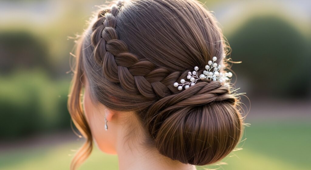 6. The Waterfall Braid into a Loose Bun: Start a waterfall braid along your hairline, then incorporate it into a low, messy bun. It’s an elegant updo that looks intricate but is built on a simple foundation.