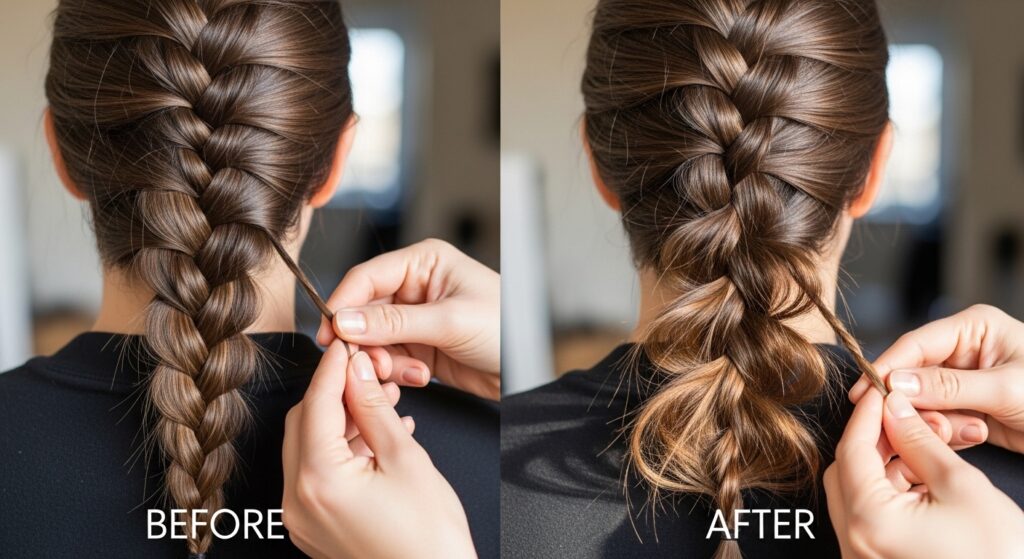 Pull and Loosen for Softness: Once your braid is complete and secured, gently pull on the outer loops of the braid and the dropped sections to create a softer, fuller, more romantic appearance.