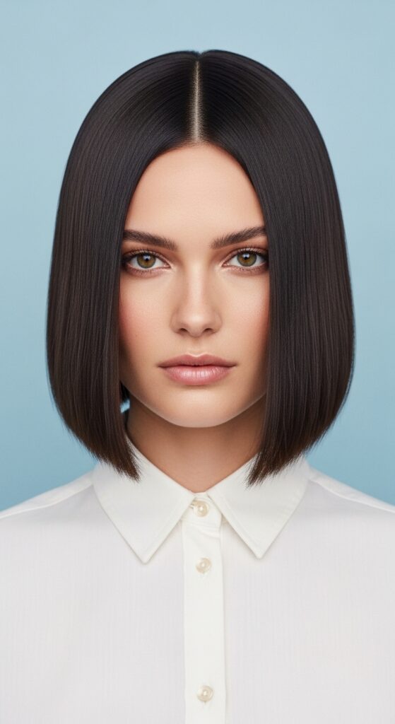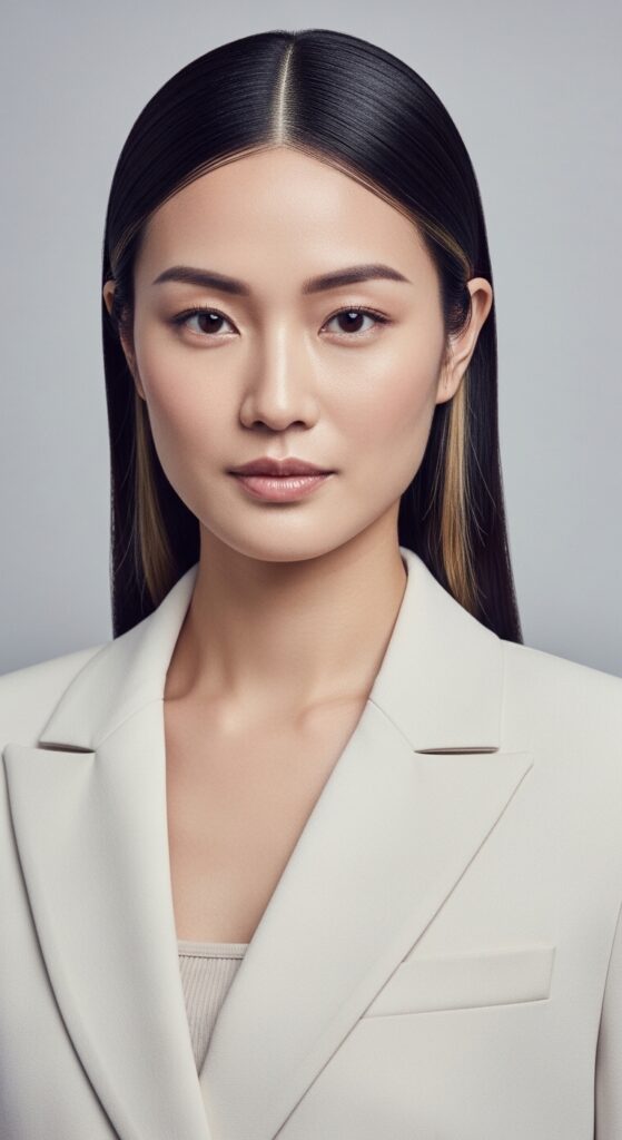 There’s something very grounded about a clean middle part. It feels intentional, calm, and direct. This look works best with straight or slightly wavy hair that’s been blown dry smooth. Use a tiny bit of shine serum to keep flyaways at bay, but don’t overdo it—you want natural shine, not wet hair.