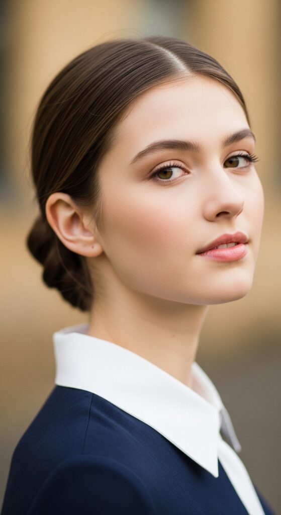 The trick is to leave a few wispy pieces by your ears. It makes the style look modern and soft, not stiff. Pair it with a silk blouse or a simple turtleneck. It says, “I respect tradition, and I have great posture.”