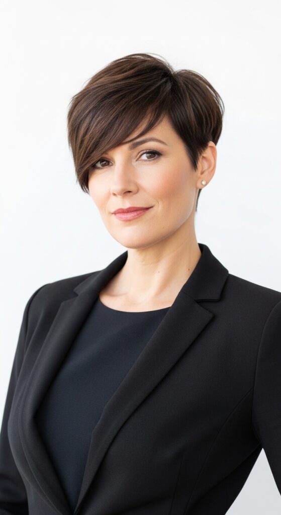 For super short pixies, focus on the bangs. Sweep them to the side or let them fall slightly forward. This cut works amazing for showing off your earrings and your face. It’s confident, direct, and perfect for any role that requires decisiveness.