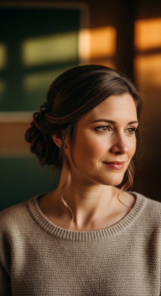 For interviews, keep the messiness controlled. You don’t want it looking unkempt. The goal is relaxed chic, not “I just rolled out of bed.” A few face-framing pieces soften it. This works beautifully with a silk scarf or a soft blouse.