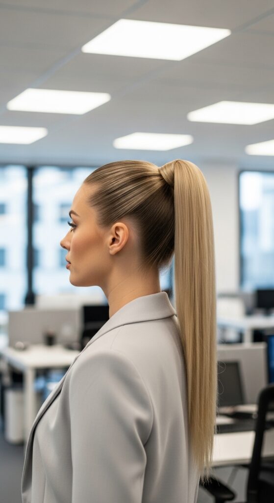 Keep the ponytail low—at the nape of your neck, not above your ears. Pull the front hair back gently, but leave a few soft pieces around your face to keep it from looking severe. It’s fast, professional, and almost impossible to mess up.