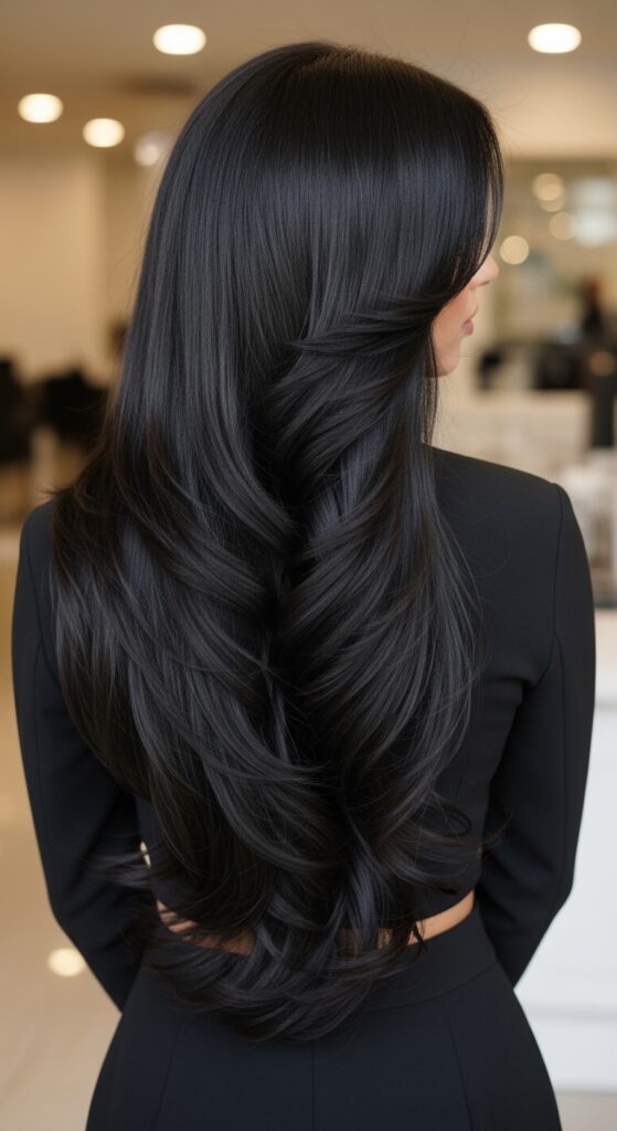 Glass hair is all about extreme shine and smoothness, and layers can still work here. Internal razor layers remove bulk while keeping the hair ultra-sleek. I love how this style looks like liquid metal, and it reduces the puffiness that thick hair often has.