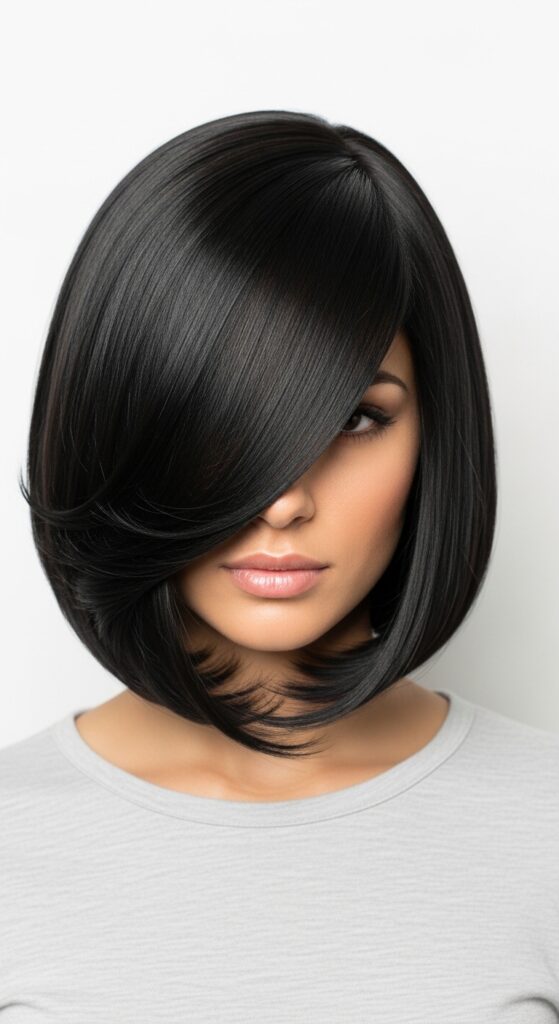 An angled bob that’s shorter in the back and longer in the front, with a layered crown, is a power move for thick hair. The layers in the crown reduce bulk at the top, while the angle slims the overall shape. It’s sharp, modern, and very flattering.