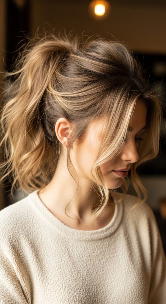 - Secure the ponytail lower to balance the top volume.