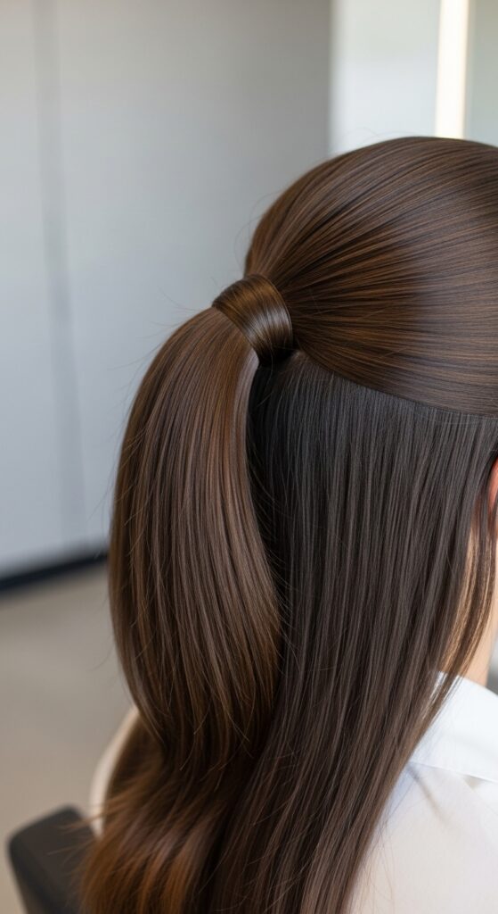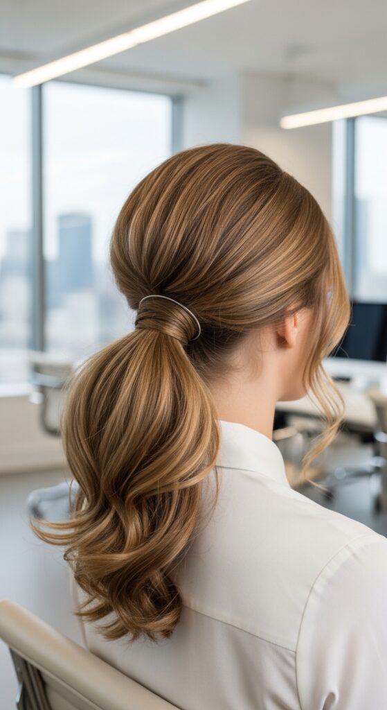 That’s why I’m obsessed with the half-up, low ponytail. It’s the ultimate business casual hero. It keeps hair out of your face for focus, looks intentionally chic, and takes literally two minutes.