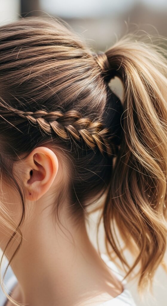 On one side of your part, take a small section near your hairline. Create a simple three-strand braid and incorporate it into the half-up ponytail as you gather the hair.