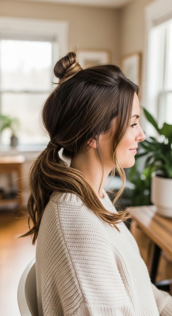 Create the half-up section, but instead of a ponytail, twist it into a small, messy bun. Leave the rest of your hair down in a low ponytail or simply loose.