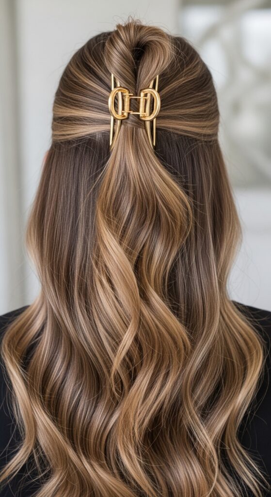 Gather the top section, twist it once, and fold it up towards your crown. Secure it with a decorative claw clip. Let the rest of your hair flow down.